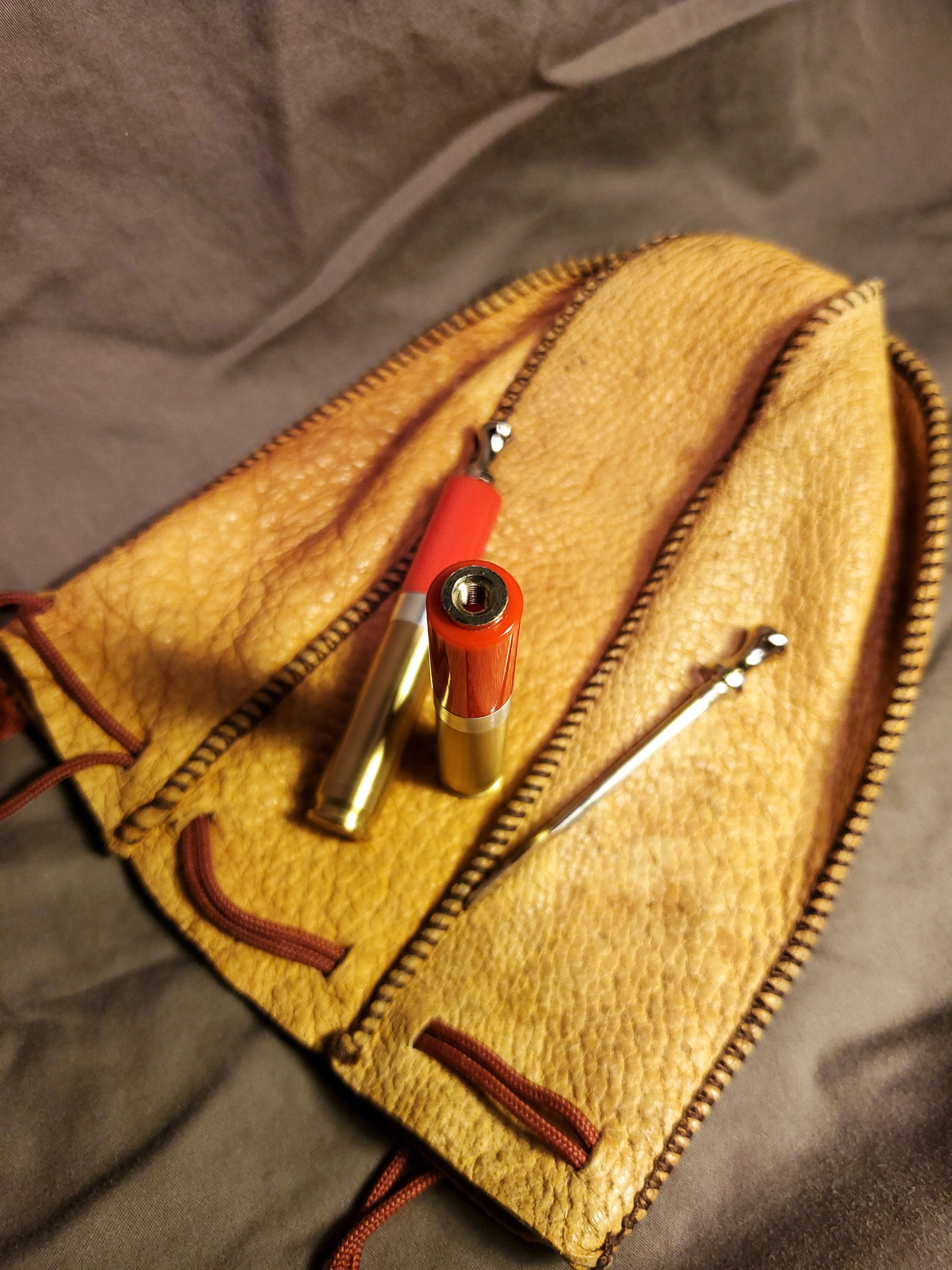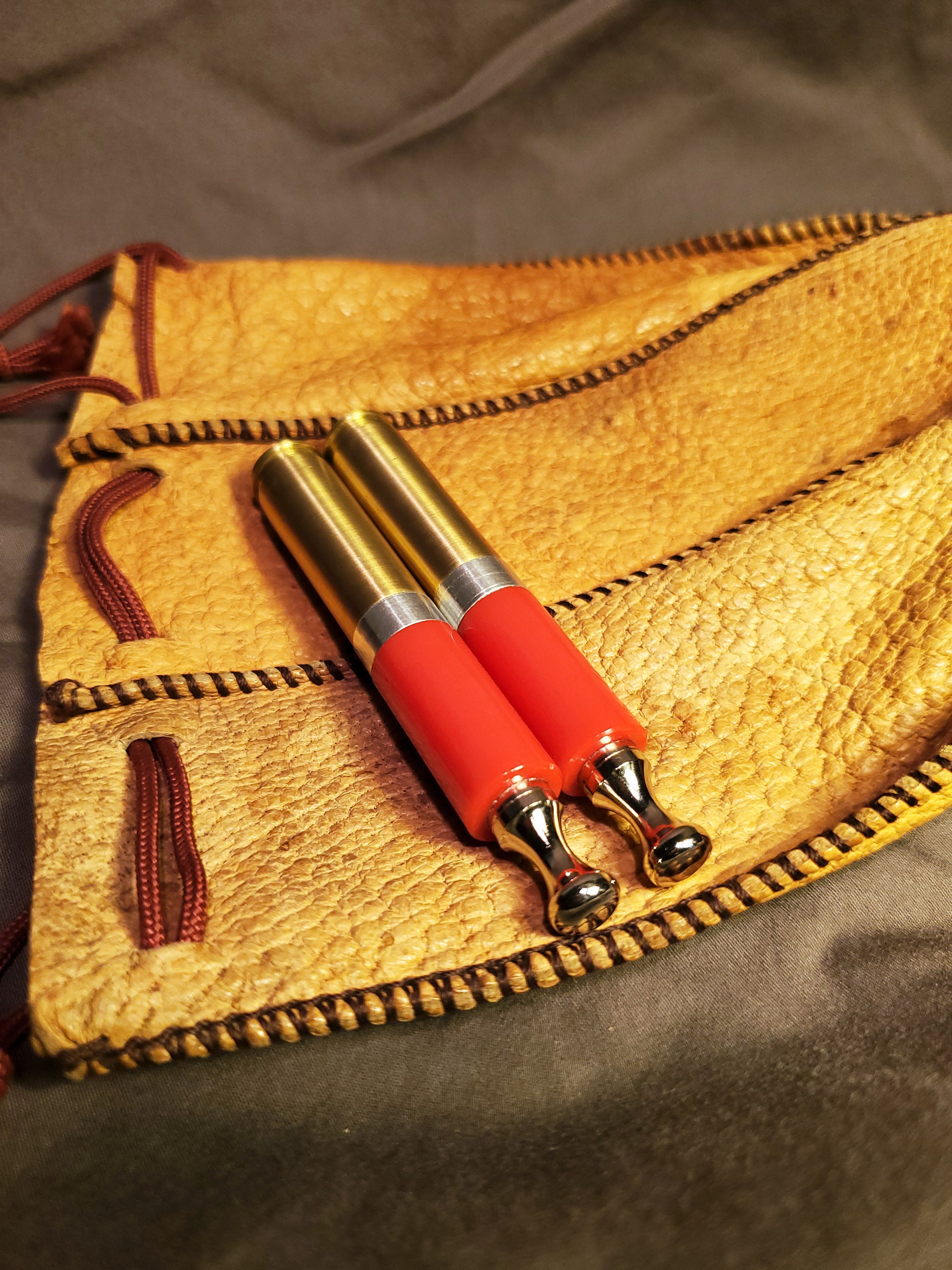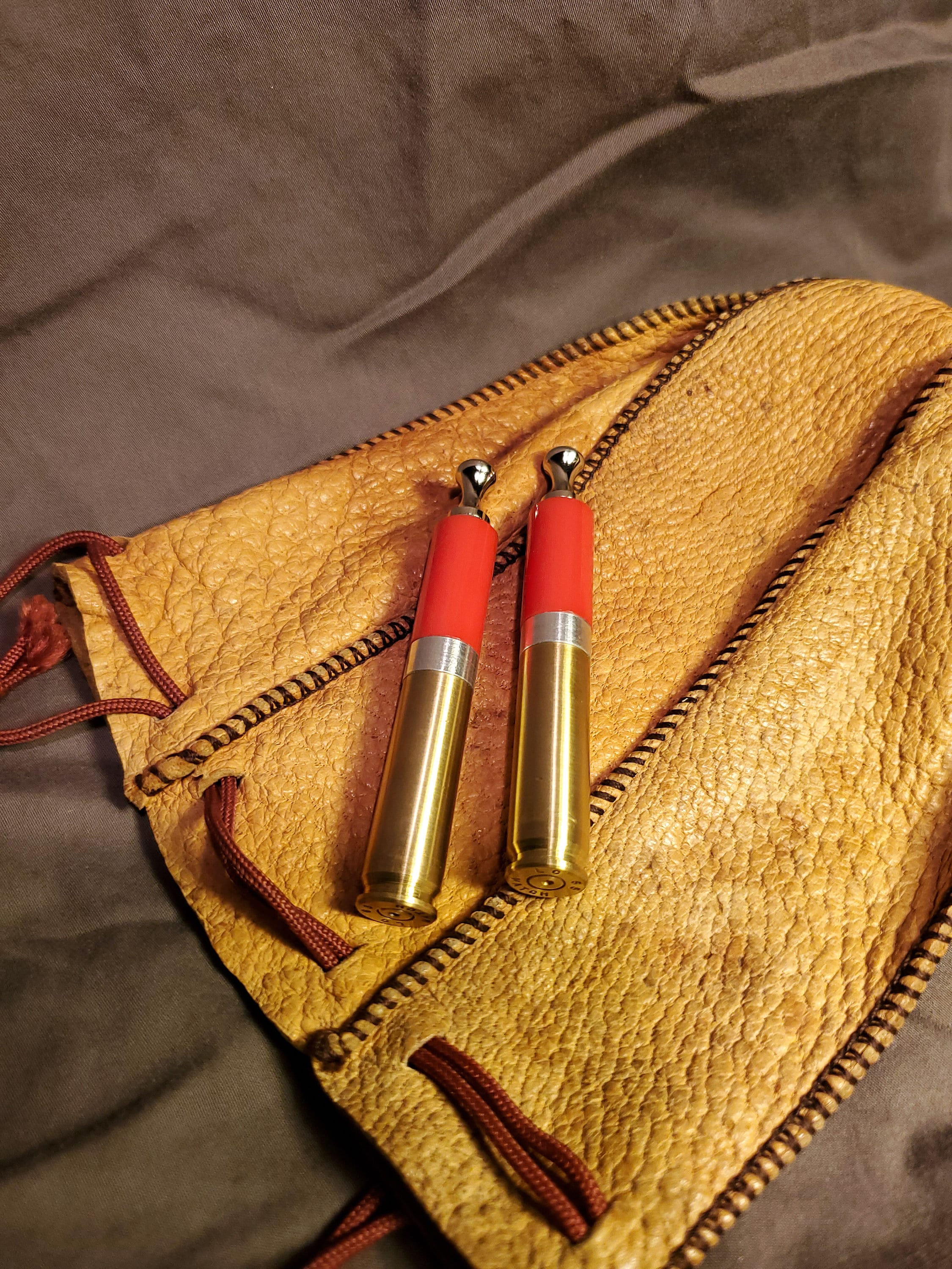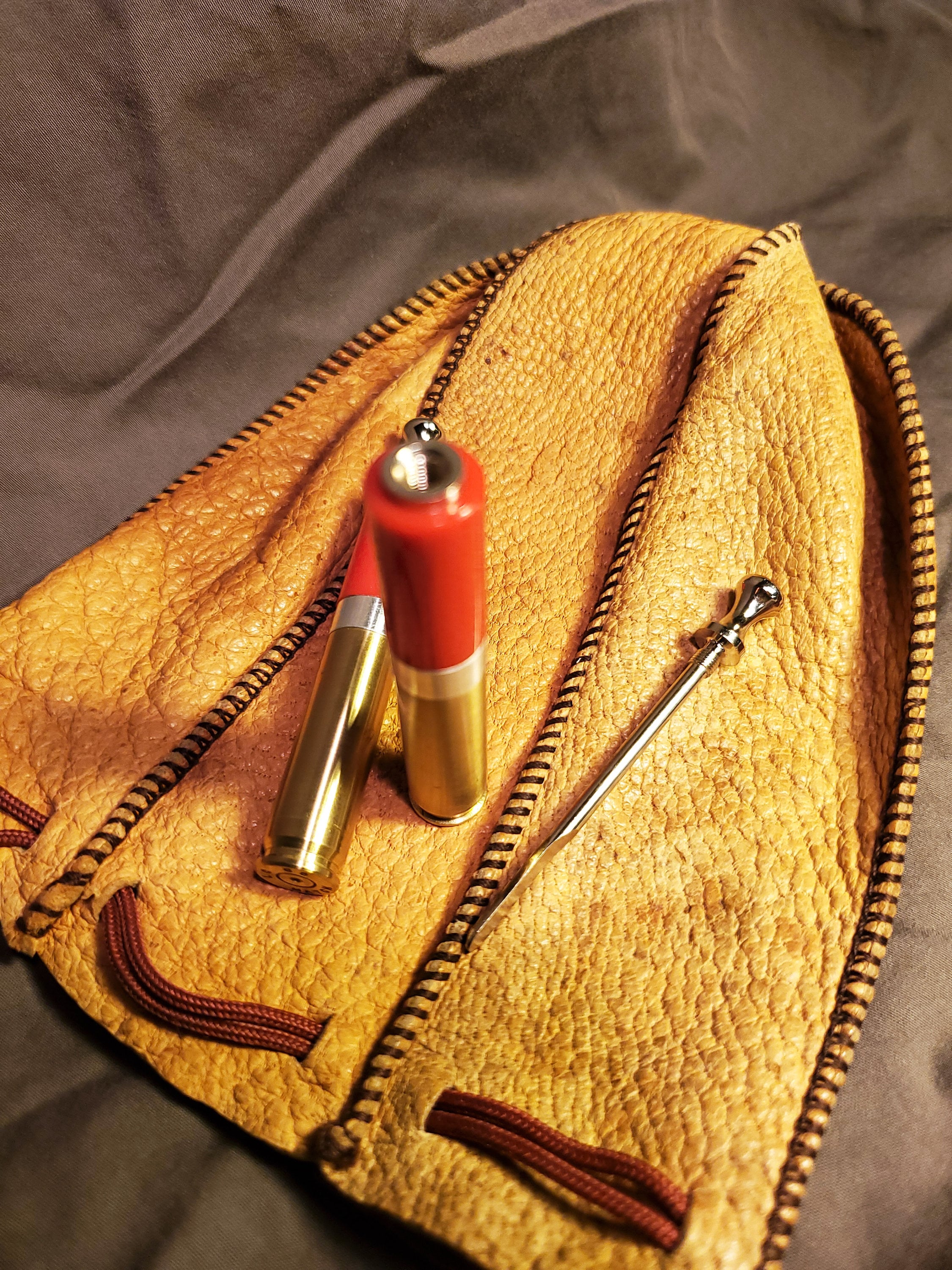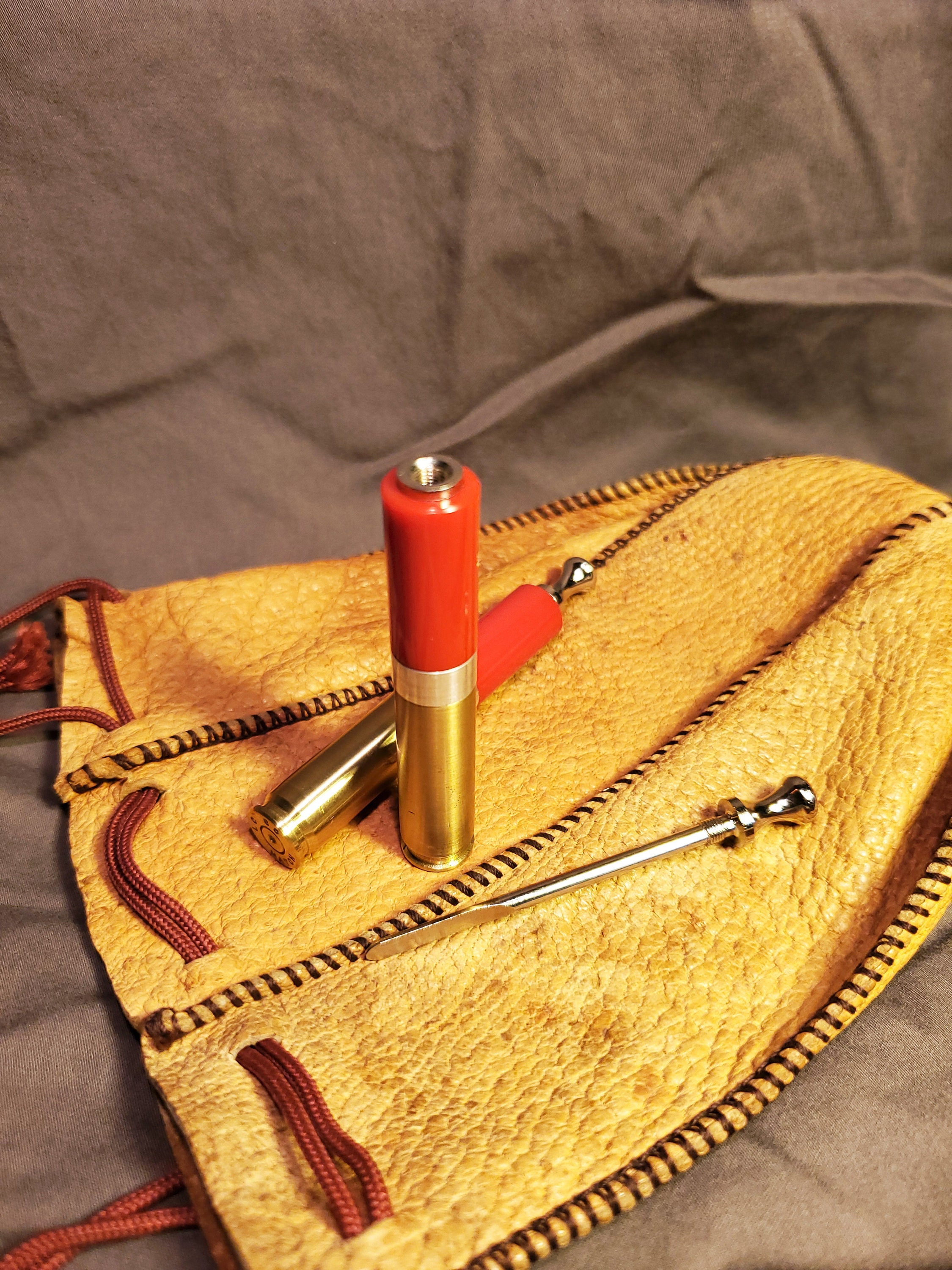 This brass rifle casing tobacco pipe tamper is made of highly polished, solid red acrylic and includes a threaded poker tool. It has a brushed finish and is stamped "LC 65 MATCH" on the bottom (known as a headstamp). I added weight to the base to increase heft and stability. I also machined an aluminum spacer to fit in between the casing and acrylic. The tool is nickel plated steel with a contoured head and a sloped tip.