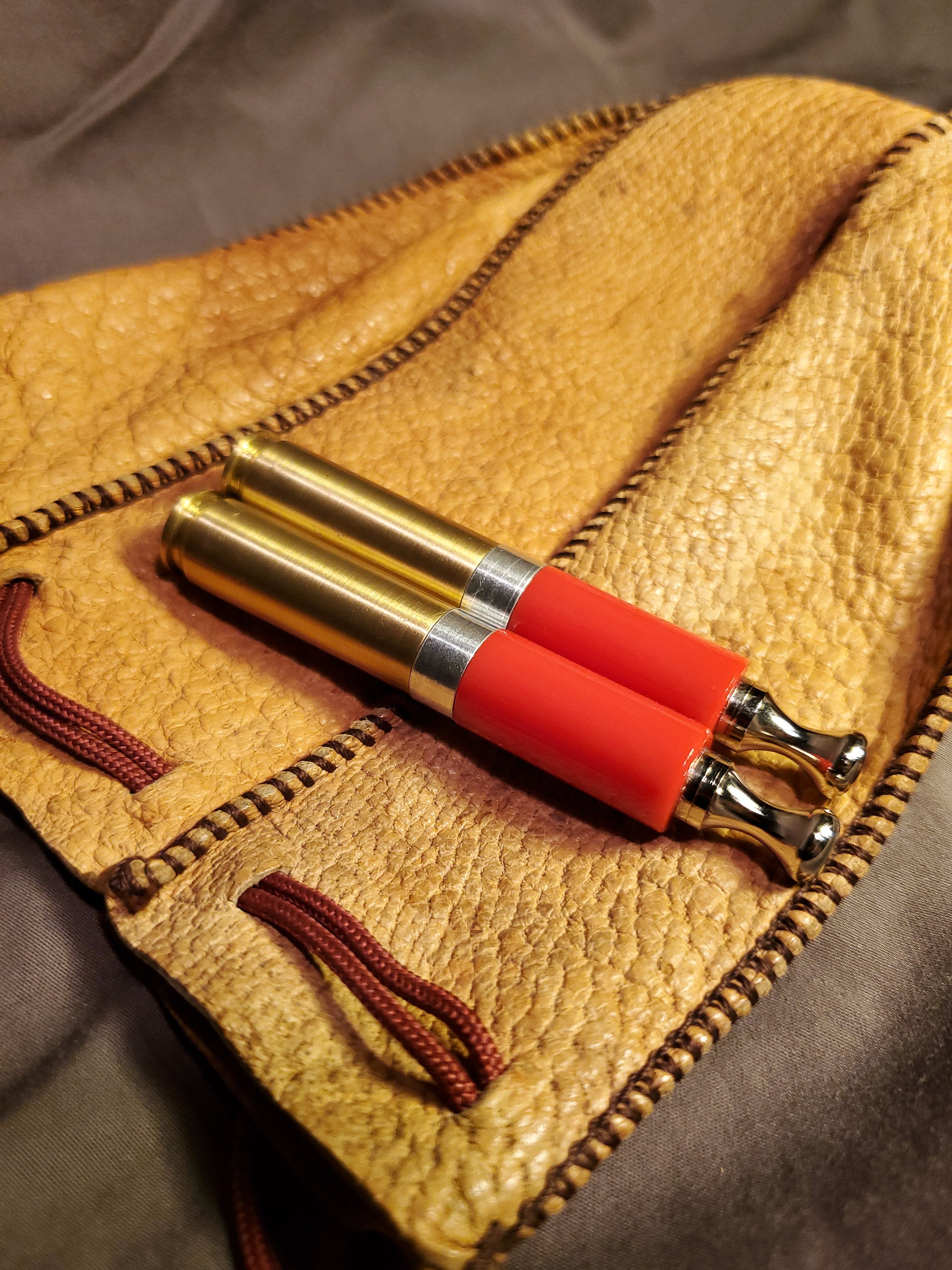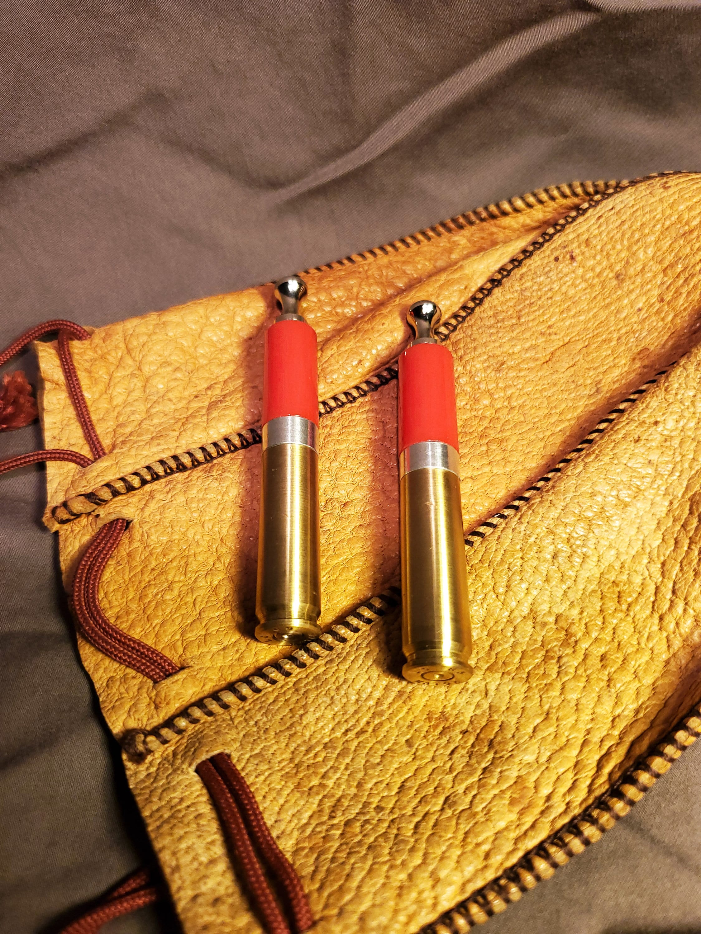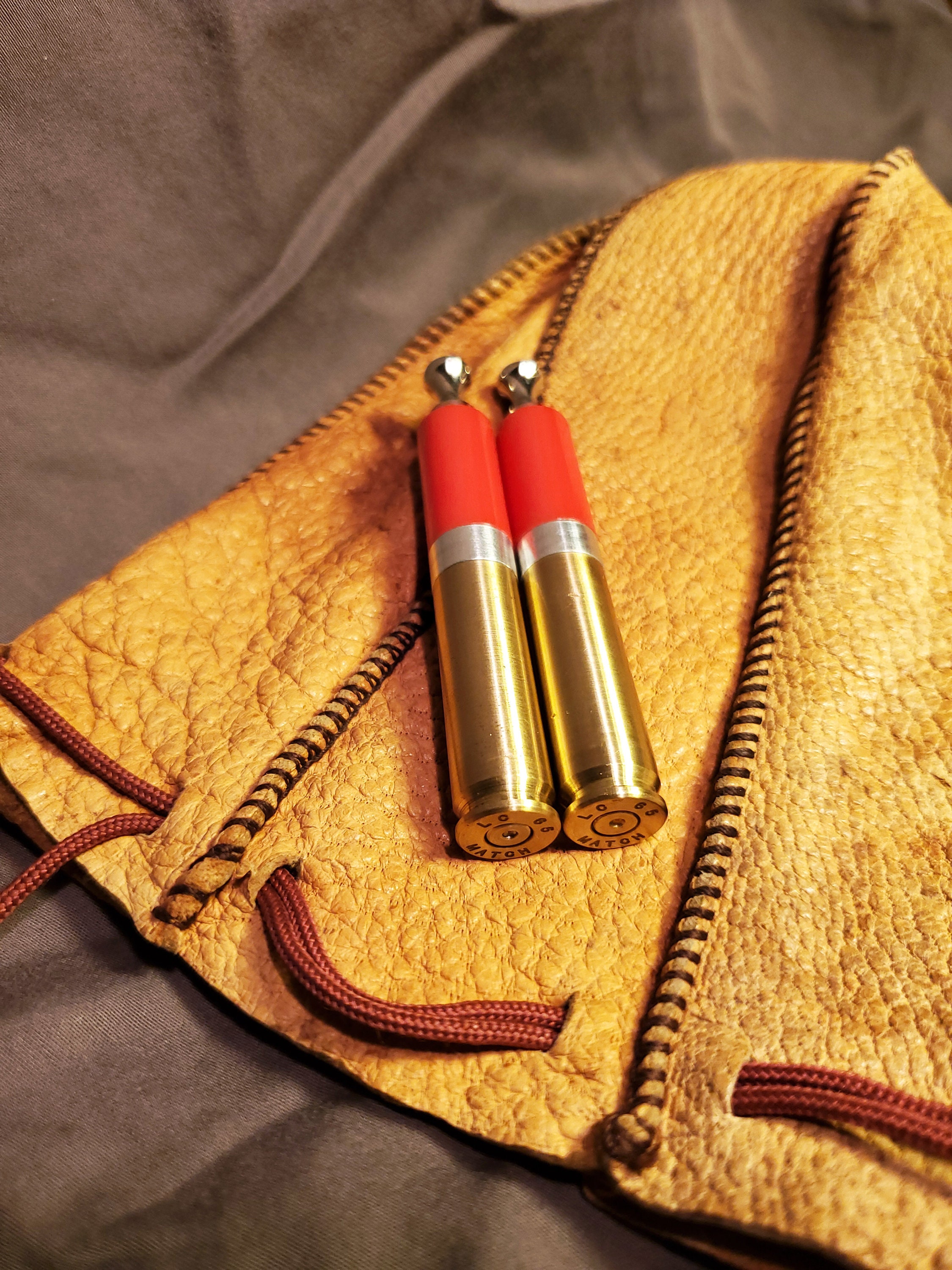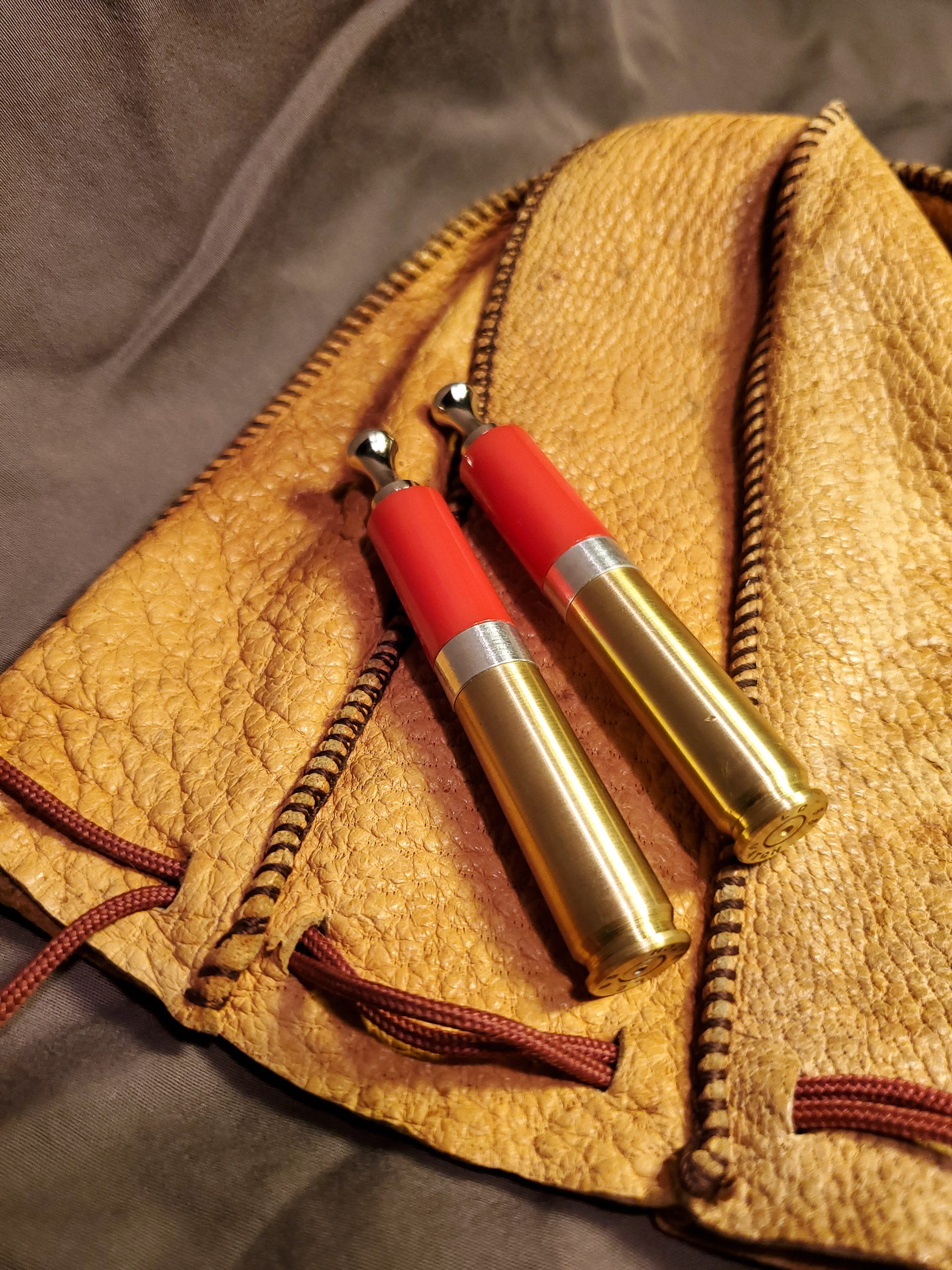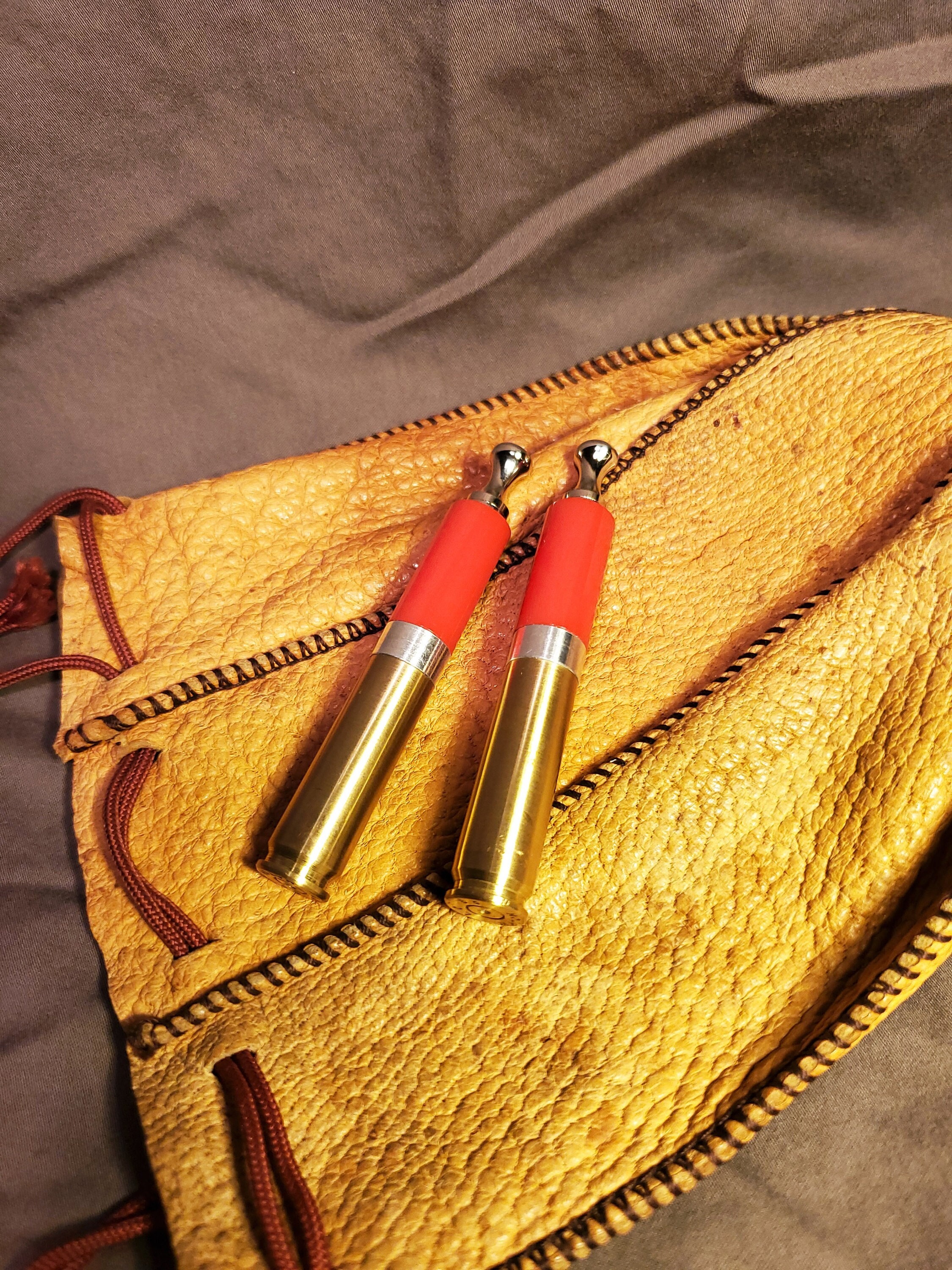 This brass rifle casing tobacco pipe tamper is made of highly polished, solid red acrylic and includes a threaded poker tool. It has a brushed finish and is stamped "LC 65 MATCH" on the bottom (known as a headstamp). I added weight to the base to increase heft and stability. I also machined an aluminum spacer to fit in between the casing and acrylic. The tool is nickel plated steel with a contoured head and a sloped tip.